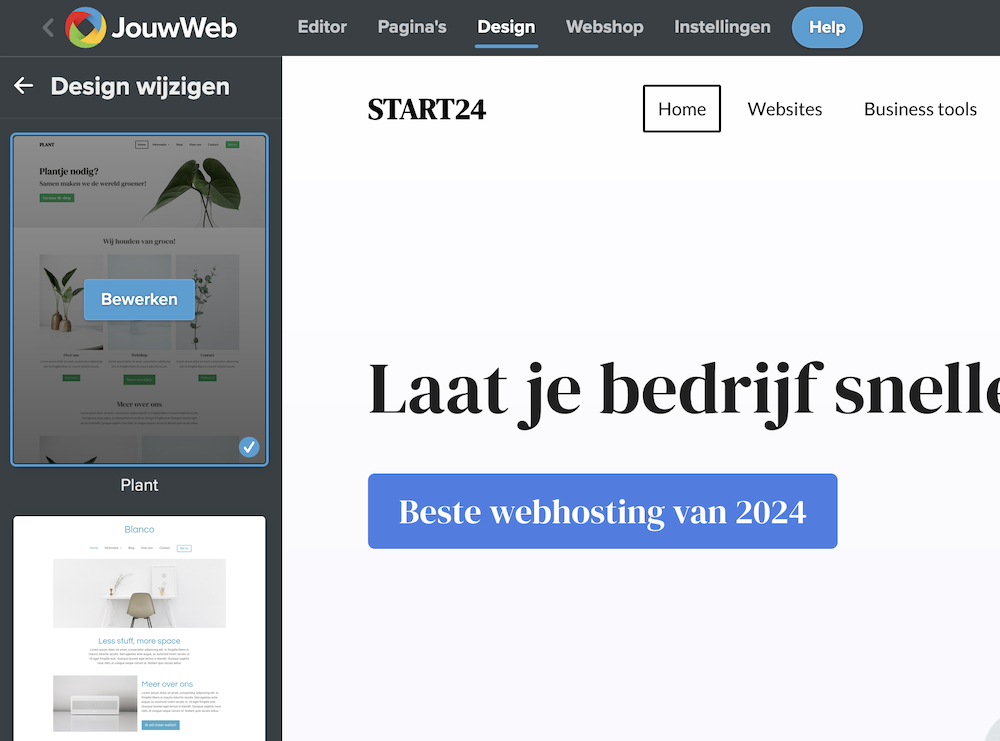 Om bij het begin te beginnen: wanneer je met JouwWeb een site opzet doe je dit aan de hand van een template. Ik koos voor het Blanco template omdat dit vrij neutraal oogt en qua kleurenschema redelijk overeen leek te komen met Start24.