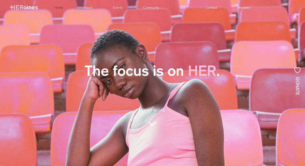HERoines is een site van een non-profit. Het gebruikt een feminien kleurenschema en effectieve beelden die perfect aansluiten bij waar de organisatie voor staat.