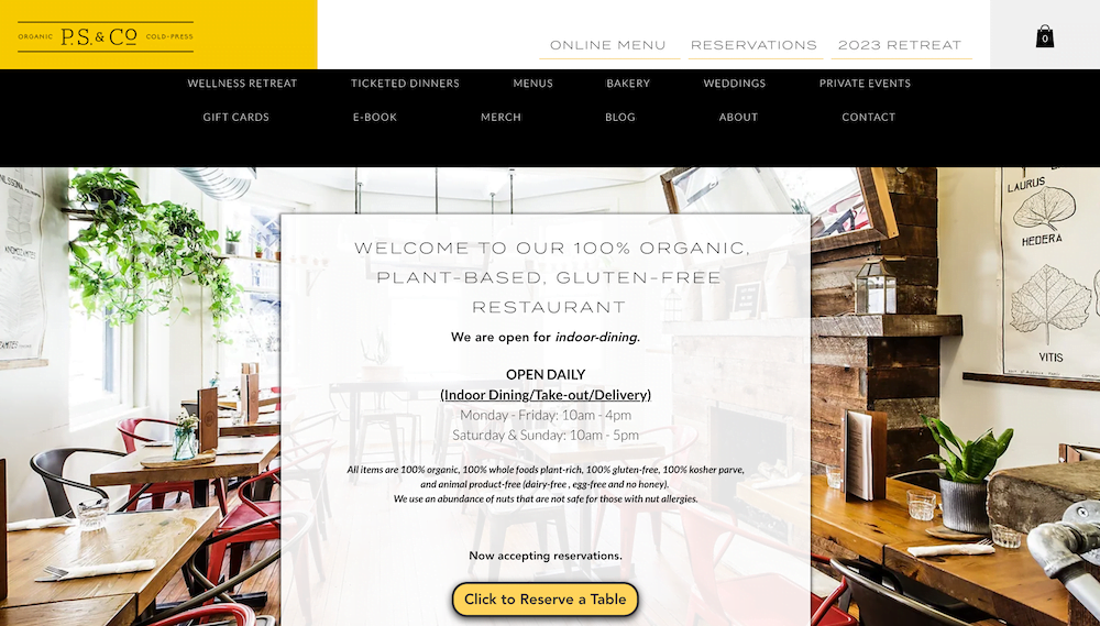 De site doet een aantal dingen erg goed. Het bevat niet alleen de essentiële elementen zoals het verhaal wat achter het bedrijf schuilt, contact informatie en een menu, maar je kunt ook reserveringen maken direct via je de site. Dit dankzij de Wix reservering app.