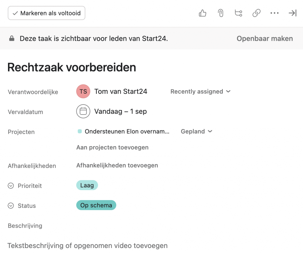 Doordat je in taken dus gemakkelijk (kleinere) subtaken kan maken hoef je niet voor alles een heel project te maken, maar manage je een “grotere” taak dus gemakkelijk in de taak zelf met een lijst.