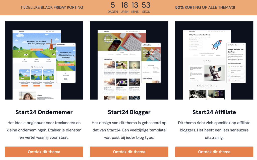 Ook bij Start24 konden we de verleiding niet weerstaan: t/m 27 november kun je onze WordPress thema's en WordPress cursus met 50% korting aanschaffen.