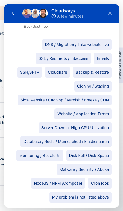 Het kan vervelend zijn om je eerst door een chatbot heen te moeten ploeteren, maar gezien de prijsstelling van Cloudways (die vrij laag ligt) vind ik het niet onredelijk.