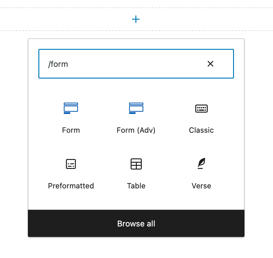 Je kunt bij Kadence een formulier toevoegen door het Form block te kiezen (Form (Adv) als je Kadence Pro gebruikt).