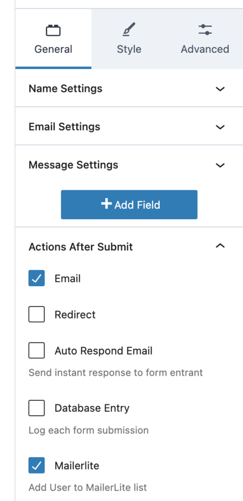 Zoals je hieronder ziet, kun je nadat een bezoeker een bericht stuurt via het contactformulier, verschillende acties uitvoeren. Hieronder vallen het sturen van een email, een automatische response sturen, het bericht aan een database toevoegen of de bezoeker aan een email marketing software lijst toevoegen.