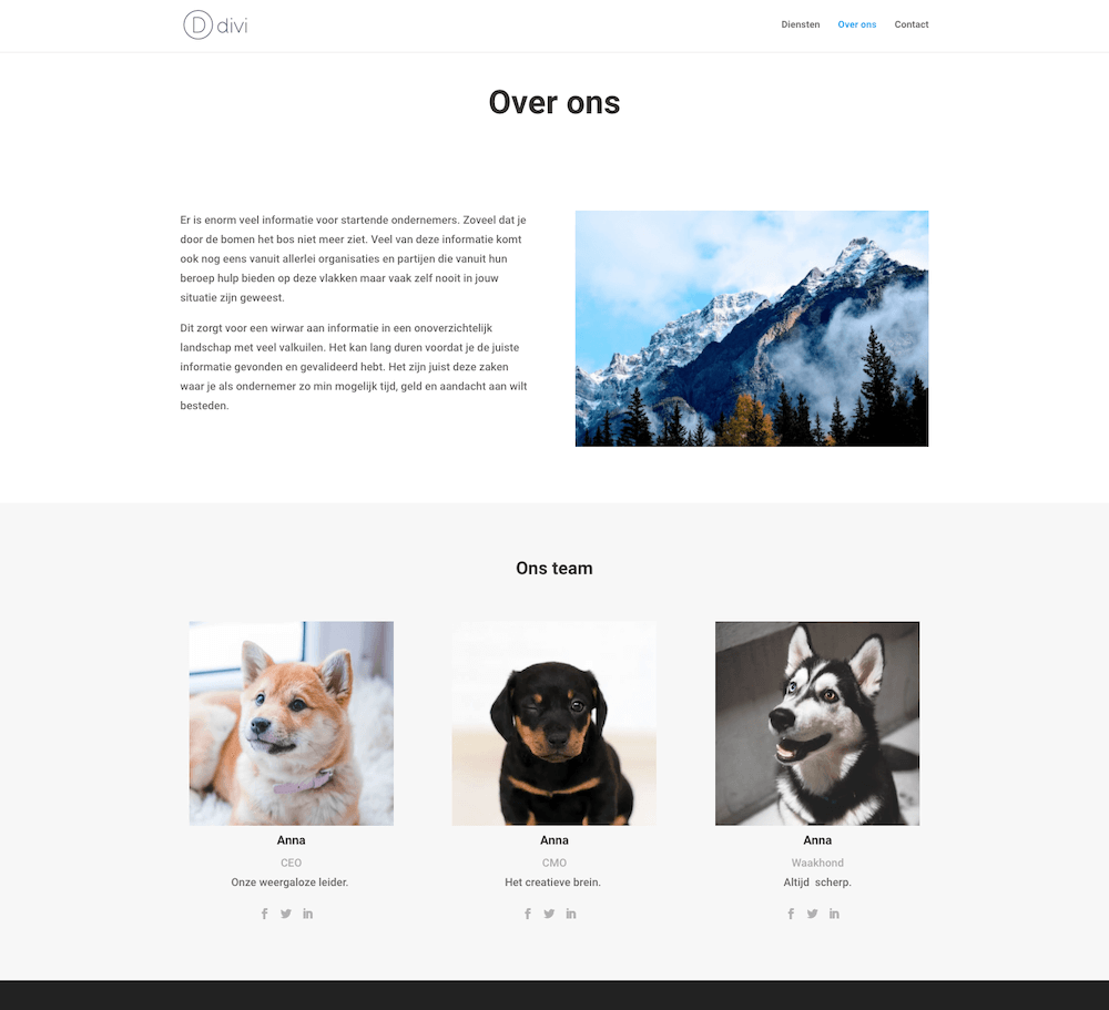 Hij heeft een homepage, een diensten pagina, een team pagina, en een contact pagina. Dit is een uitstekende basis voor de meeste websites.