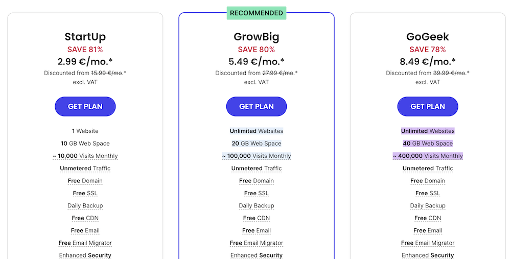 Kijken we naar StartUp en GrowBig, dan zijn de grootste verschillen het aantal sites per pakket, hoeveel bezoekersaantallen je kunt ontvangen, betere caching en backups op aanvraag.
