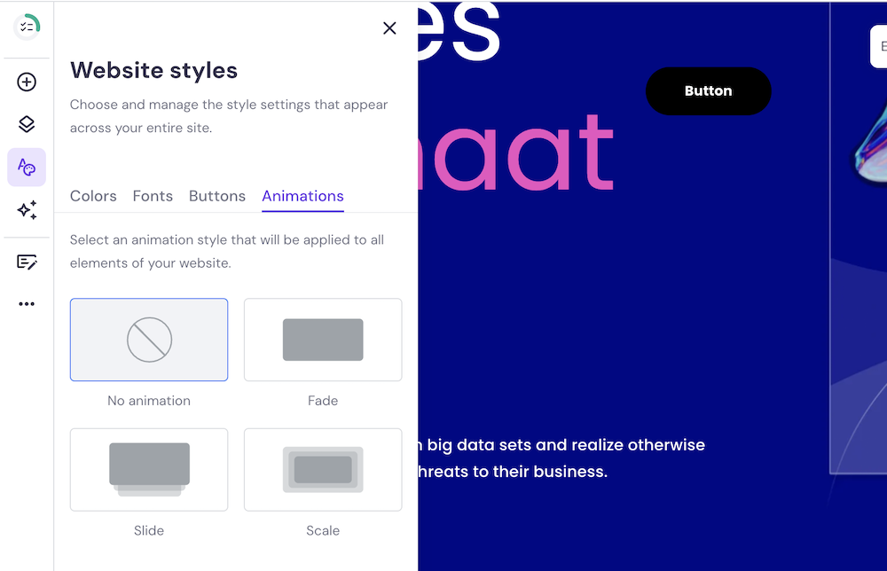 Met de Hostinger Website Bouwer kun je ook gemakkelijk website brede veranderingen toevoegen. Denk aan het in- en uitschakelen van animaties, het aanpassen van je kleurenpalet of het aanpassen van je lettertypes.