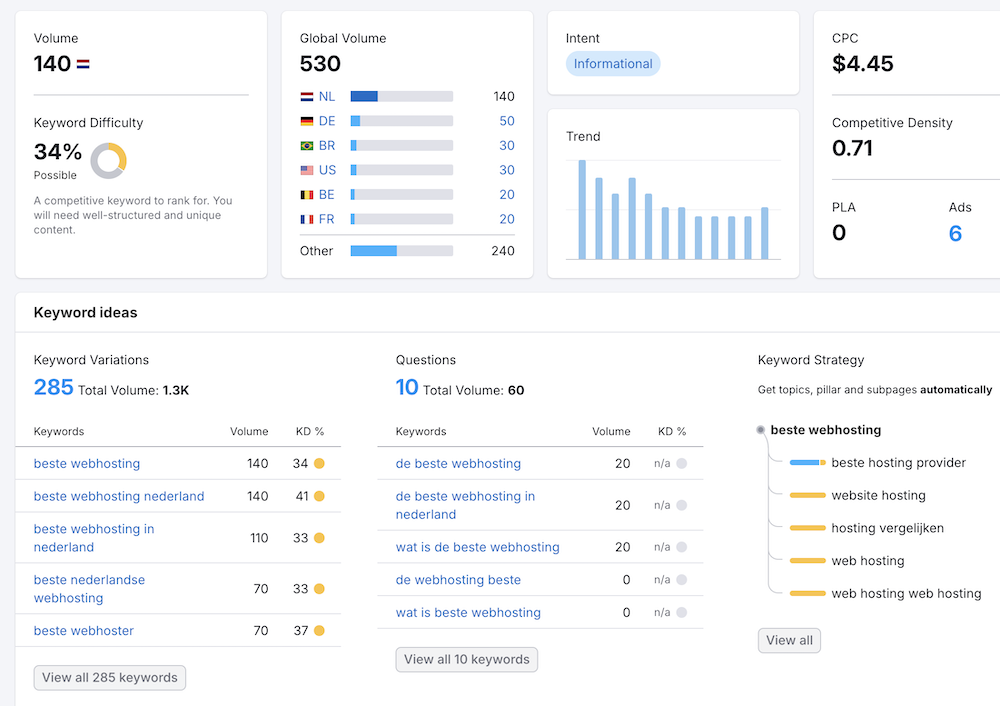 Met de Keyword Overview feature kun je een uitgebreide analyse van een bepaald zoekwoord krijgen.