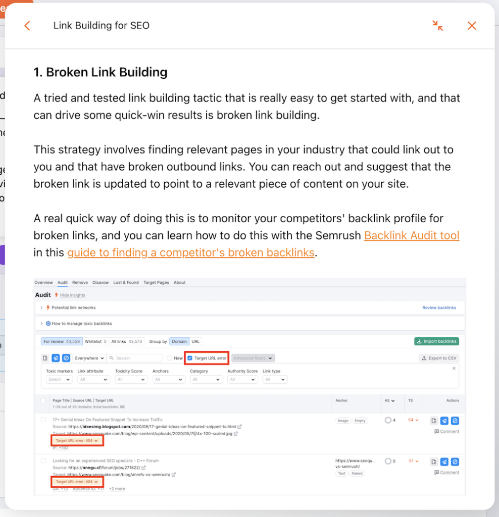 Bijvoorbeeld, wanneer je de organische rankings van een website analyseert, kun je snel de backlinks, verkeersstatistieken en meer van die site bekijken. Door op specifieke statistieken te klikken (zoals backlinks), krijg je toegang tot uitgebreide rapporten in andere tools (zoals Backlink Analytics).