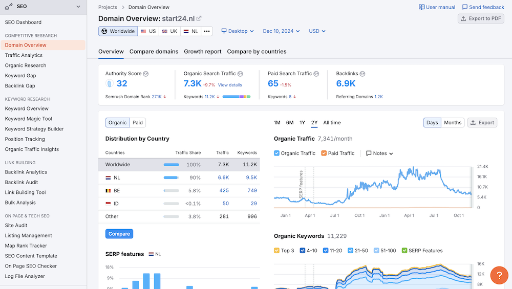 Semrush biedt een uitgebreid pakket aan krachtige marketingtools, ondersteund door een enorme database met zoekwoorden, backlinks en advertentiegegevens. Het is niet verrassend dat Semrush een van de meest populaire tools in de marketingwereld is geworden.