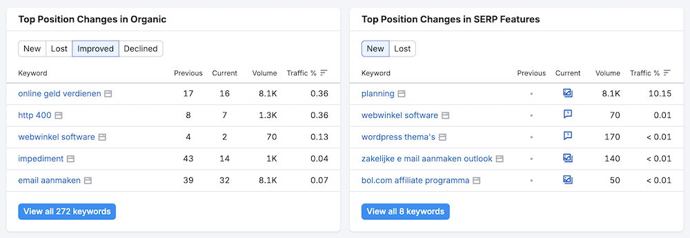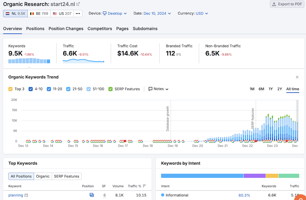 Je ziet in dit overzicht hoe het organische en betaalde verkeer van een site zich binnen een bepaalde periode ontwikkeld, of de zoekwoorden waarvoor de site toeneemt of afneemt en wat (naar schatting) de zoekwoorden van een site zijn die het meeste verkeer binnenhalen.