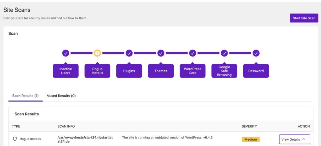 Een interessante feature hier is Site Scan, die je op ieder moment kunt draaien, maar ook twee keer per dag automatisch draait en je op de hoogte stelt van eventuele zwaktes qua veiligheid waar je site mee te maken heeft.