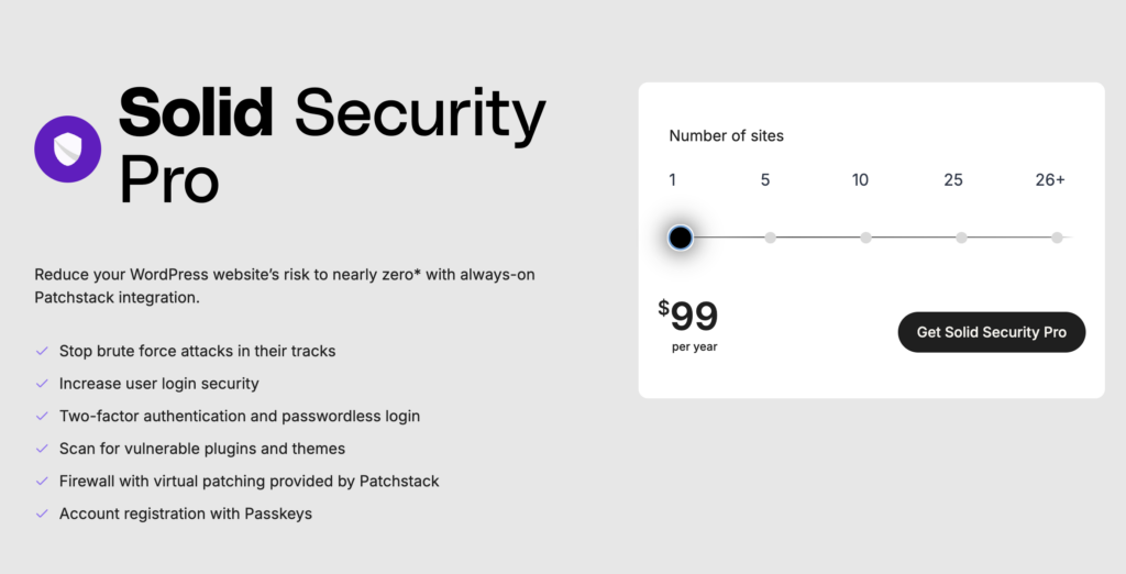 Solid Security Pro kost $99 per jaar voor een enkele website. Voor 5 websites betaal je $199 en voor 25 websites $549. De features zijn bij alle pakketten hetzelfde.