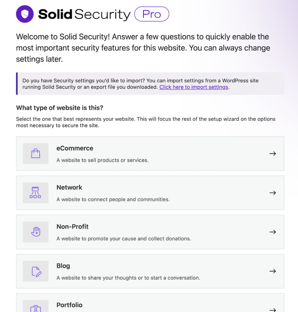 Na installatie stelt Solid Security een aantal vragen. Allereerst moet je aangeven wat voor type site je beheert (maar maak je geen zorgen, je kunt deze instellingen altijd nog later aanpassen).