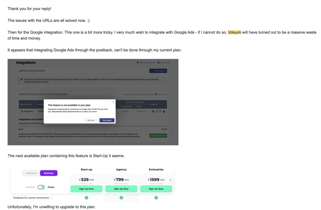 Ik wist natuurlijk ook wel dat wat ik ook zou zeggen, Voluum me geen refund zouden gaan geven.