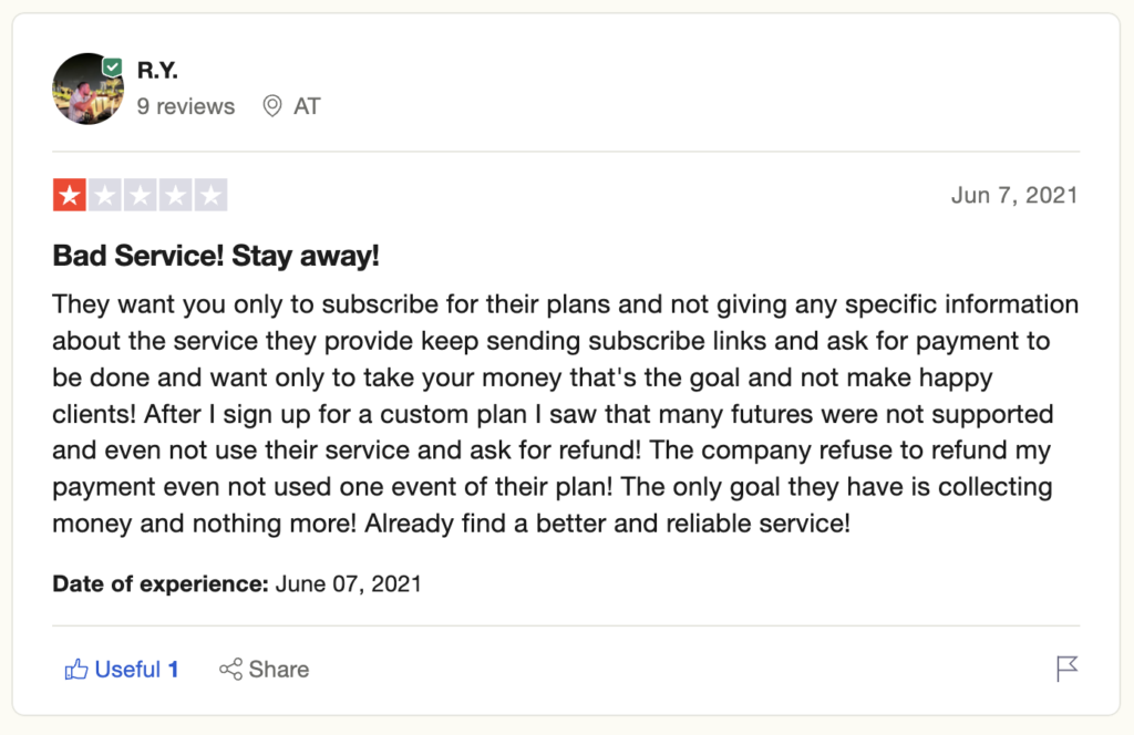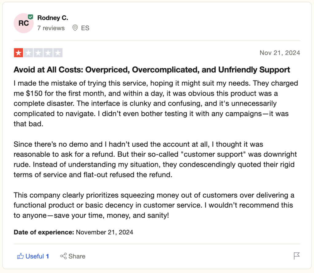 Op G2 en Capterra vind je verraderlijk hoge gemiddelde review scores. Een mogelijke verklaring: mijn eigen negatieve review werd in eerste instantie bij beide platforms niet geplaatst. Bij een van de twee duurde het een aantal weken met meerdere revisies, en bij het andere platform is de review nog steeds niet geaccepteerd.