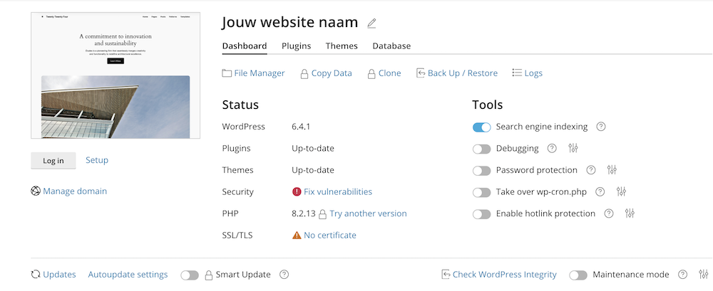 Daarna kun je een SSL certificaat installeren en kun je met je site in de weer gaan.