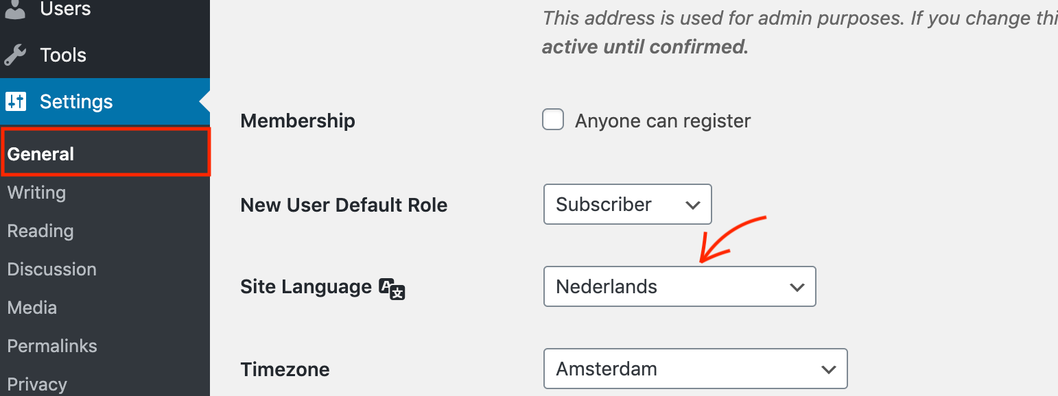Klik op Settings » General in het WordPress dashboard. Kies Nederlands bij Site Language en drup op Save Changes onderaan de pagina.