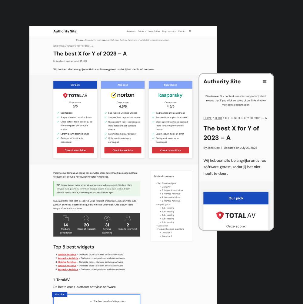 Werkt met de gratis versie van Kadence. Kant-en-klaar WordPress thema specifiek ontworpen voor affiliate sites. Bekijk hier de demosite.
